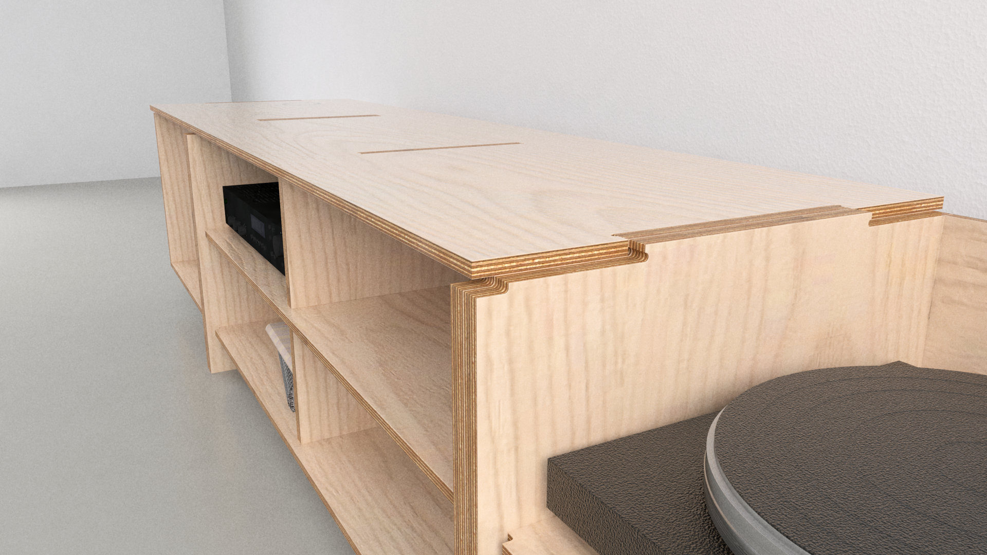 A media console designed to be CNC milled from 3 pieces of plywood.